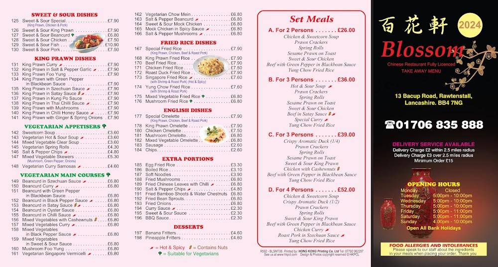 Located at 13 Bacup Rd, Rossendale, BB4 7NG, Blossom Restaurant & Takeaway stands out as a beloved gem among locals. This vibrant establishment prides itself on serving delicious Chinese dishes in a warm and inviting setting that easily feels like home. The atmosphere is casual, making it a perfect destination for families, friends, or anyone looking to enjoy a relaxing meal. With easy free street parking available, it’s convenient to pop in for a quick bite or to grab a takeaway for later. The restaurant is open daily, accommodating everyone from busy professionals to families enjoying dinner together.